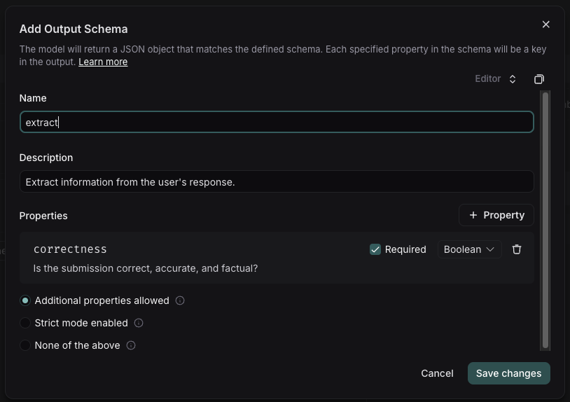 Adding an output schema to your prompt will get output in a structured format. Learn more about structured output here.