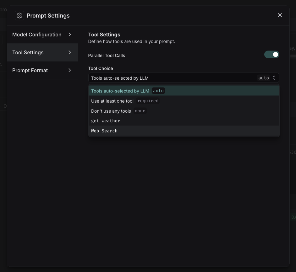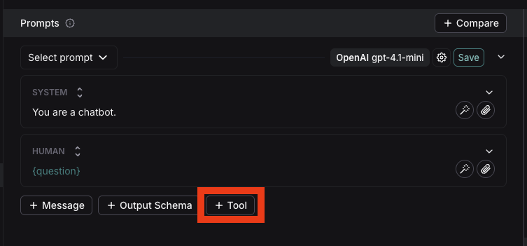 To add a tool to your prompt, click the + Tool button at the bottom of the prompt editor.