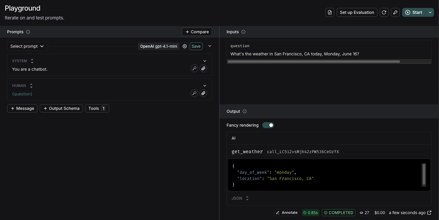 2. Custom tools: Functions you define to perform specific tasks. These are useful when you need to integrate with your own systems or create specialized functionality. When you define custom tools within the LangSmith Playground, you can verify that the model correctly identifies and calls these tools with the correct arguments. Soon we plan to support executing these custom tool calls directly.